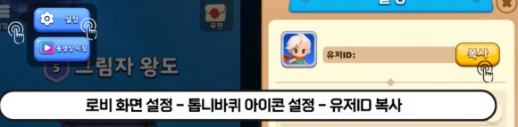 우선 게임 내 로비 화면에서 설정을 선택하시고 유저 ID를 복사합니다.
