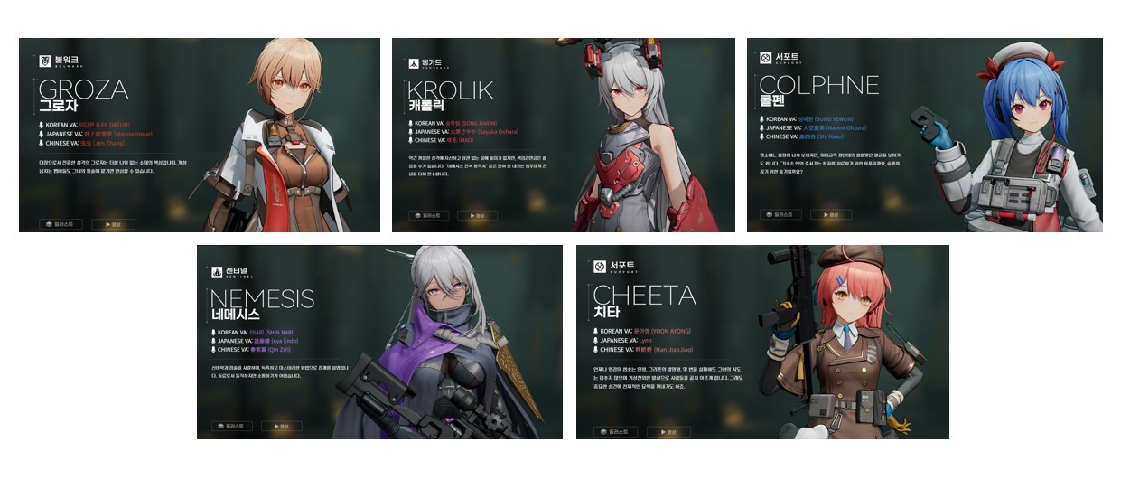 현재 공개된 캐릭터로는 그로자,캐롤릭,콜펜,네메시스,치타 5개의 캐릭터가 공개되었으며, 전작에서도 등장했던 캐릭터들이라서 전작을 즐겨하시던 분들이라면 너무 반가울 것 같습니다.
