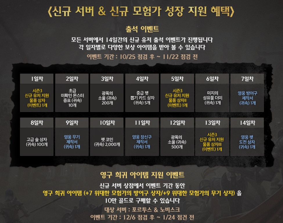 신서버 오픈이지만 서버 상관없이 전서버 신규유저에게 출석만 한다면 무려 영웅 방어구, 무기, 장신구, 펫 상자를 지급합니다. 영구 희귀 아이템을 10만 골드에 구매할 수 있는 이벤트는 12월에 신서버에서만 진행한다고 하니 참고하시길 바랍니다. 신규 유저라면 굳이 진입 장벽이 있는 구서버보다는 신서버를 하시는 게 좋겠죠? 따라서 신서버에서 플레이하시려는 분들은 사전예약도 하시는 것을 추천드립니다.